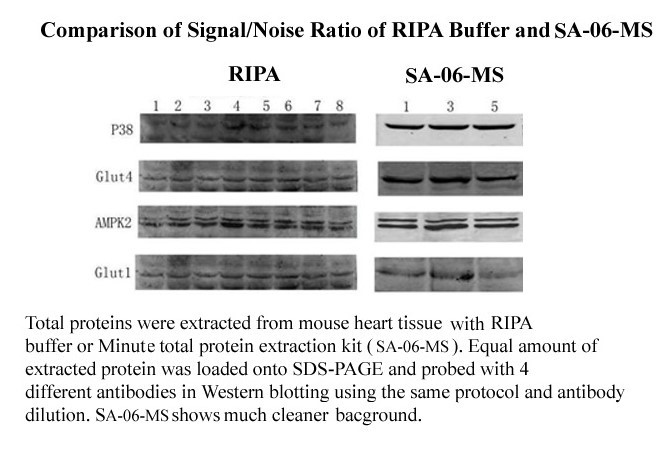 Many factors can contribute to high background in WB, such as improperly diluted antibodies, insufficient blocking, interference from blocking reagents, insufficient washing and poor quality of transfer membranes. However, the method/reagent used for protein extraction/sample preparation has been overlooked. Few researchers actually realize that the methods for protein extraction can significantly impact the background. The following two figures show side by side comparisons of the effect of protein extraction methods on WB background when RIPA buffer was compared with the spin column-based MinuteTM Protein Extraction Kits